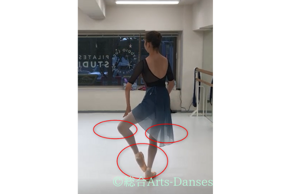 こうすることで足に余計な負担をかけず太くならないし、正しい軸を作りながら甲だしのタンジュができます。